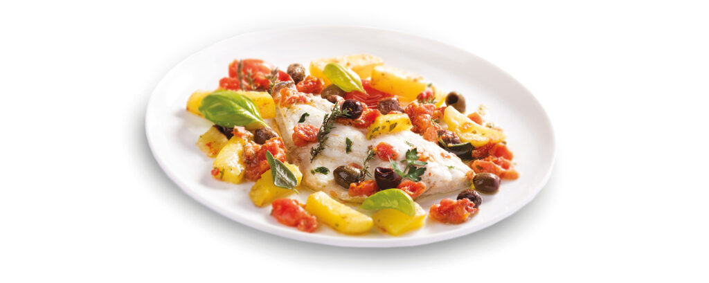 Usane 4 confezioni, una per ogni commensale: il pesce si scioglie in bocca, sposandosi con la delicatezza di patate e pomodori, unita a quel tocco di sapido dato dalle olive taggiasche. Impossibile, di nuovo, non fare scarpetta! È facile e veloce, adagia le 4 porzioni di orata in una pirofila, e mettila in forno a 220° per 15 minuti. Sentirai che profumo non appena apri il forno! Se vuoi prepararlo in padella invece, aggiungi mezzo bicchiere d’acqua e lascia cuocere a fuoco medio per 4 minuti con coperchio, più altri 3 senza. Il piatto è già completo così, ma se vuoi accompagnarlo in modo semplice e naturale puoi aggiungere a lato un po’ di fresca insalata misticanza.